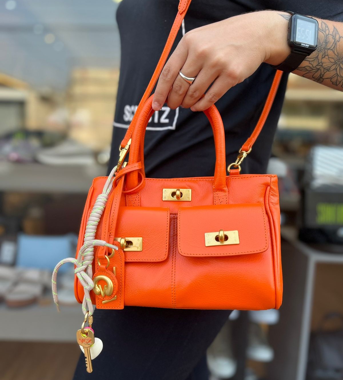 Bag em couro laranja com bolsos frontais e alça de mão. Esse modelo chegou em tons vibrantes para despertar ainda mais a sua autenticidade no dia a dia. Escolha a sua cor favorita e arrase no look!